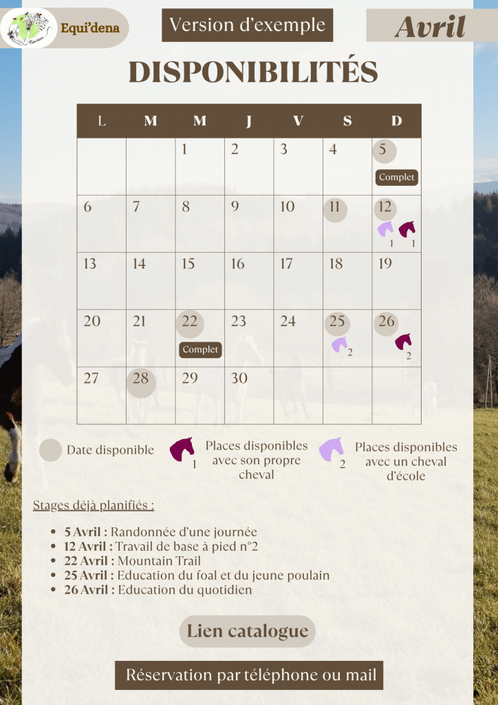 Si vous êtes à la recherche d’un lieu paisible et d’un accompagnement bienveillant afin d’apprendre à comprendre le cheval vous trouverez une liste de stages et de randonnées qui répondront à vos attentes. Equi’dena vous propose une offre variée de stages portant sur l’éducation et le débourrage de l’équidé, l’équitation de loisir et d’extérieur ainsi que le travail à pied. Les randonnées sont pour le moment exclusivement à la journée. Tous les stages et randonnées possibles sont répertoriés dans un catalogue. Vous y trouverez également ma façon d’éduquer les chevaux, d’enseigner aux cavaliers et la vie que j’offre à ma cavalerie d’école.